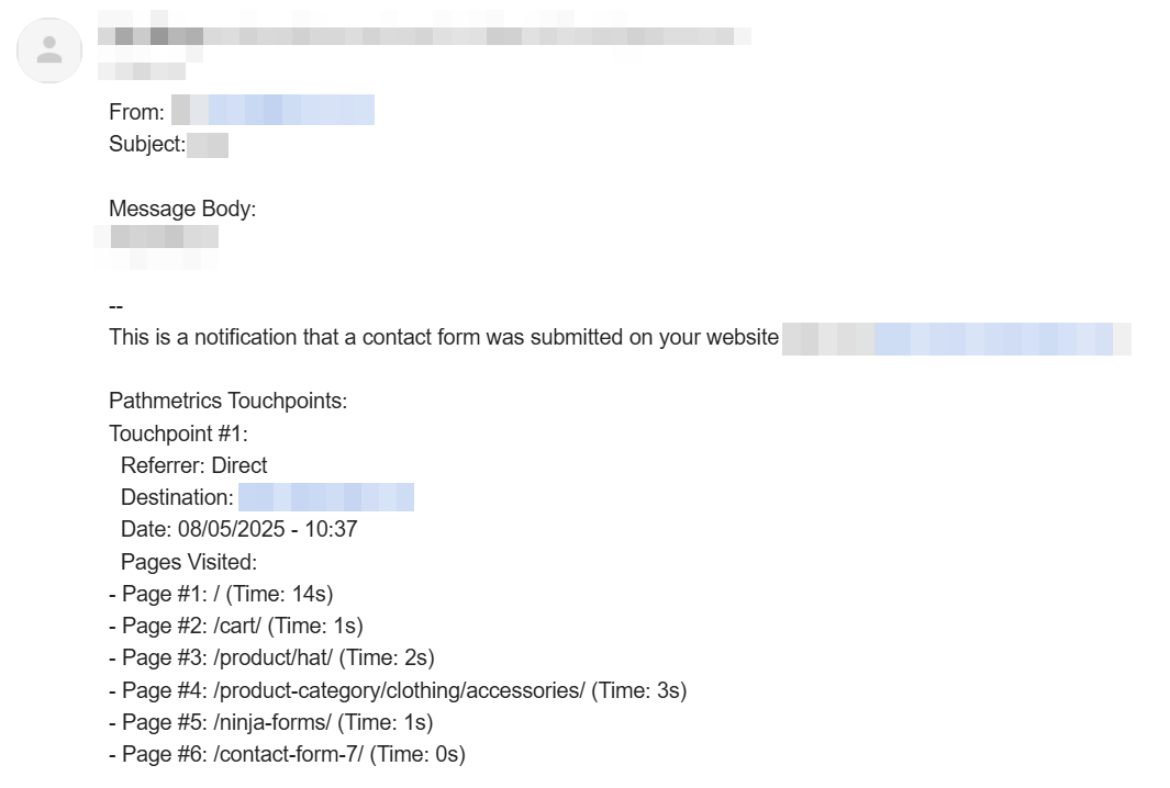 This touchpoint data is then appended to the bottom of the standard Contact Form 7 notification email. You don’t need to manually edit your form templates or email settings, it happens automatically once Pathmetrics is active and tracking.